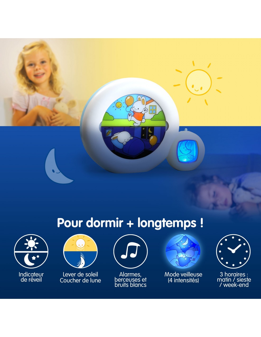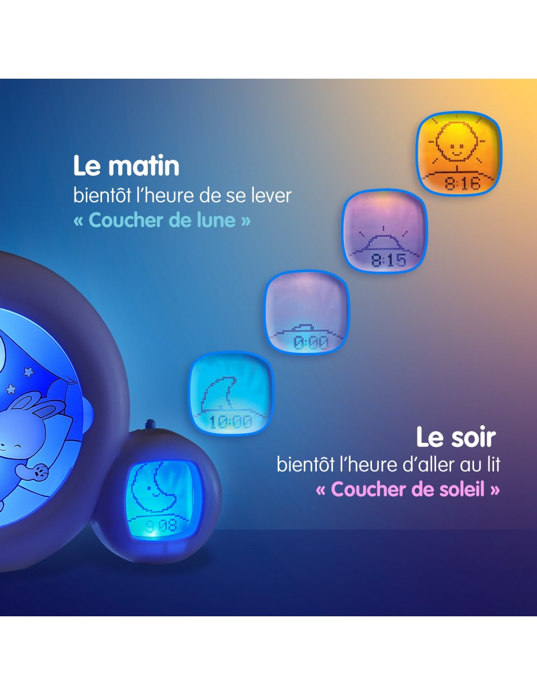 Le Kid’Sleep Moon est un indicateur de lever tout-en-un qui aide l’enfant à savoir si c’est encore l’heure de dormir ou si c’est l’heure de se lever. Si la figurine est illuminée en position de sommeil avec la lune, c’est encore l’heure de dormir. Au matin, lorsque la lune commence à se coucher (durée ajustable), l’enfant sait que c’est bientôt l’heure de se lever ! A l’heure réglée par les parents, le soleil se lève et la figurine passe en position réveillée, l’enfant sait qu’il peut se lever ! Les parents ont la possibilité de programmer 3 différentes heures: une pour le matin, une pour la sieste et une pour le weekend ! Au réveil, le passage de la position couchée/lune à la position réveillée/soleil peut se faire avec 4 alarmes à choix ou en silence pour respecter le sommeil de l’enfant ! Le Kid’Sleep peut être utilisé dès la naissance comme une veilleuse traditionnelle. Pour aider leur enfant à s’endormir, les parents peuvent mettre en route l’une des 4 berceuses disponibles : 2 musiques, fontaine ou battement du cœur intra-utérin)!