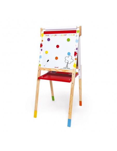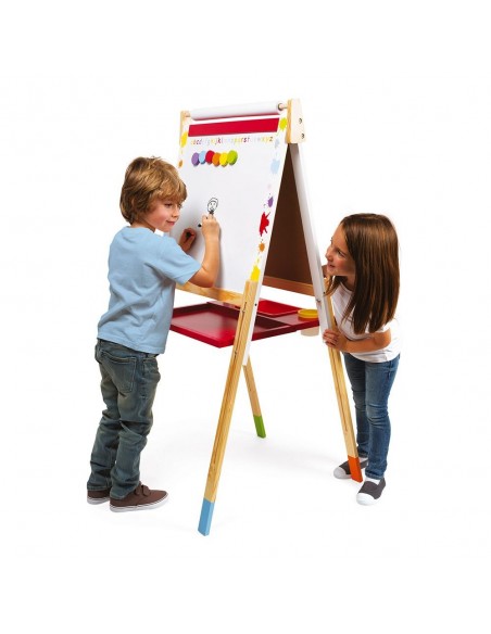 Pour l'écriture ou le dessin, le tableau en bois est un incontournable des chambres d'enfants ! A partir de 3 ans, l'envie d'écrire et de réaliser des dessins qui s'améliorent de jour en jour est de plus en plus présente chez nos enfants. Pour faciliter les réalisations et faire comme à l'école, rien de mieux qu'un tableau double faces où les tout-petits pourront tout autant se familiariser avec les feutres du tableau blanc qu'avec les craies du tableau noir ! La face blanche est magnétique, ce qui permet de jouer également avec des magnets lettres par exemple. Les pieds de ce tableau pour enfants sont réglables de 91 à 126 cm pour leur permettre d'utiliser leur tableau plus longtemps ! Pratique, le tableau est pliable pour un rangement facile. Avec ce beau jouet, vous retrouverez : 6 magnets ronds de couleur, 10 craies, 1 feutre effaçable à sec noir, 1 rouleau de papier, 1 brosse à tableau et 3 bacs de peinture en plastique.