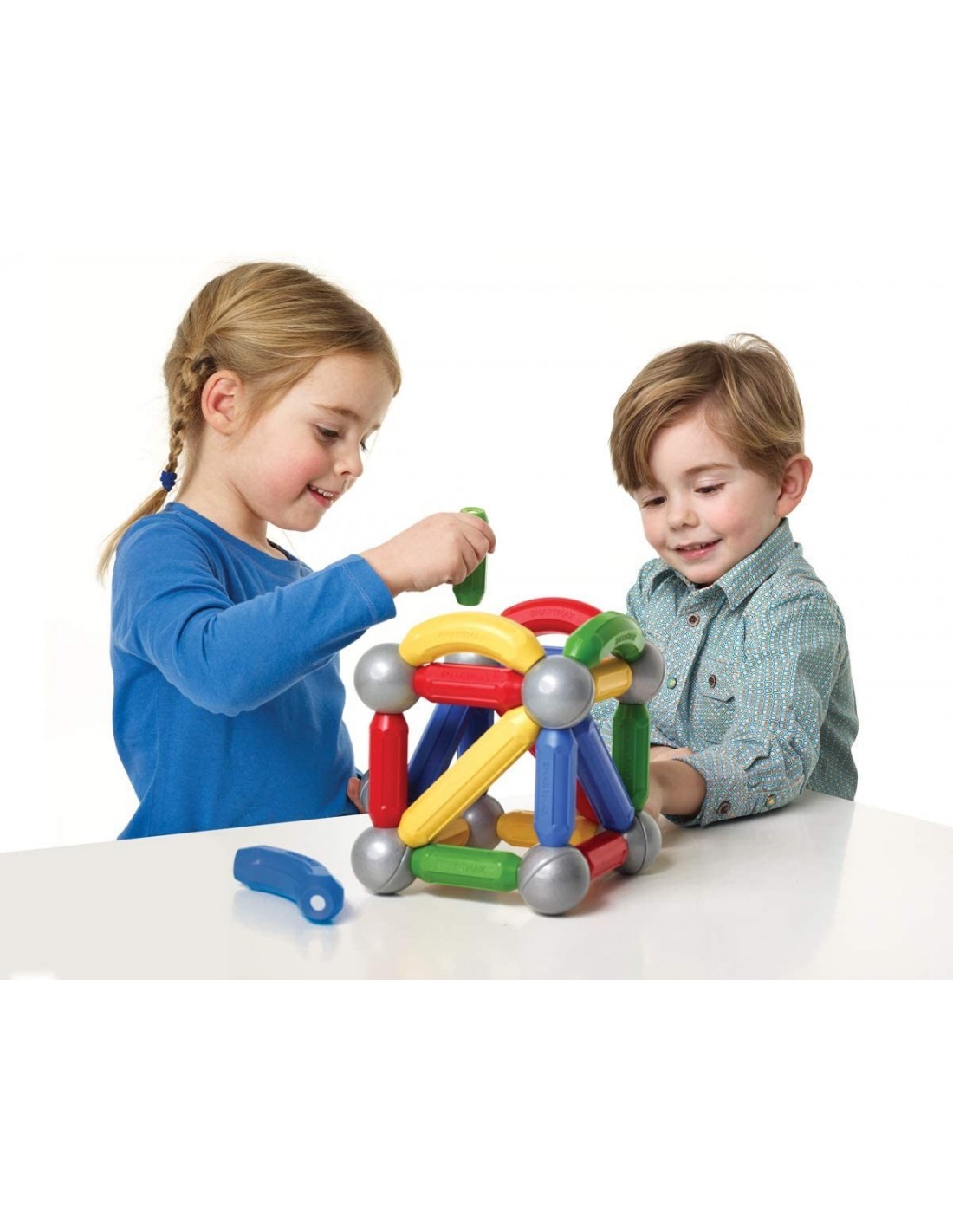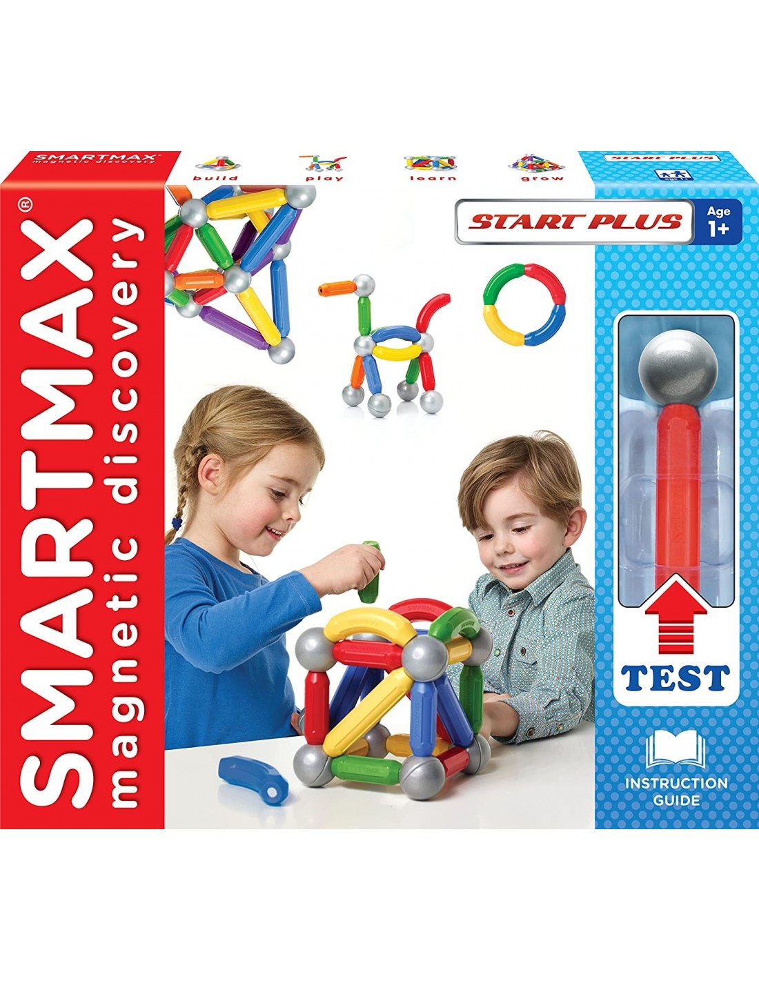 SMARTMAX permet aux enfants d'explorer le monde fascinant du magnétisme d'une manière sûre. Nord - Sud: Aimants avoir un nord magnétique et le pôle sud. Les couleurs froides, vert, bleu, violet et blanc ont leurs pôles nord dirigées vers l'extérieur. Les couleurs chaudes, rouge, orange, jaune et rose ont leurs pôles sud dirigées vers l'extérieur Attirer - Repousse: Contrairement pôles attirent, comme pôles identiques se repoussent. Tous les bars avec une couleur froide peuvent être connectés à tous les bars avec une couleur chaude. Toutes les autres combinaisons repoussent. Boules: Boules SmartMax sont attirés par toutes les barres, indépendamment de leur couleur. Plus de 20 bars peuvent être connectés à une balle. Différents Points forts: Les aimants des longues barres sont plus forts que ceux des barres courtes. Barres longues peuvent soulever plus de poids ou de faire des liens plus forts. Set contient: 12 moyennes Polonais 6 grands pôles 4 courbes Polonais 8 Métalliques billes de connexion.