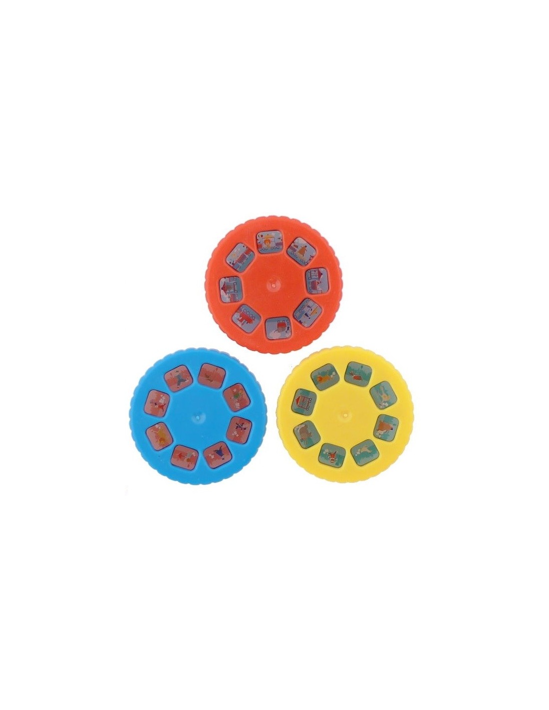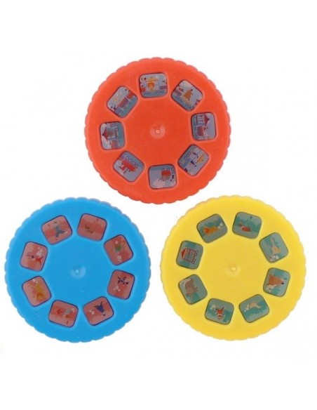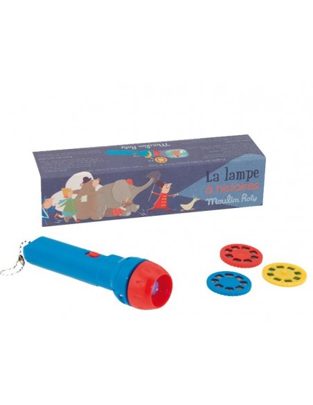 Lampe torche de poche comprenant trois disques à emboîter. Chacun des disques, projeté sur le mur raconte une histoire en couleur: - 1 : Le cirque arrive en oeille - 2 : Panique à la ménagerie - 3 : Le lion s'est échappé de la ménagerie, sauve qui peut oeillustrations dans un style très années 50, un p'tit air à la Jacques Tati.