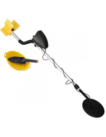 Il détecte le fer, l'acier, le cuivre, l'aluminium, l'argent et l'or. Le manche est ajustable et la sensibilité pour la fouille réglable.