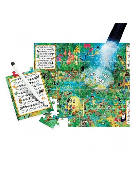 Assemblez le puzzle et observez attentivement l'illustration pour découvrir le monde fascinant de la forêt. Tout comme les véritables scientifiques, vous noterez vos découvertes au fur et à mesure. Encore mieux, avec la lampe de poche magique, vous réussirez à voir ce qui n'est pas visible à l'œil nu!