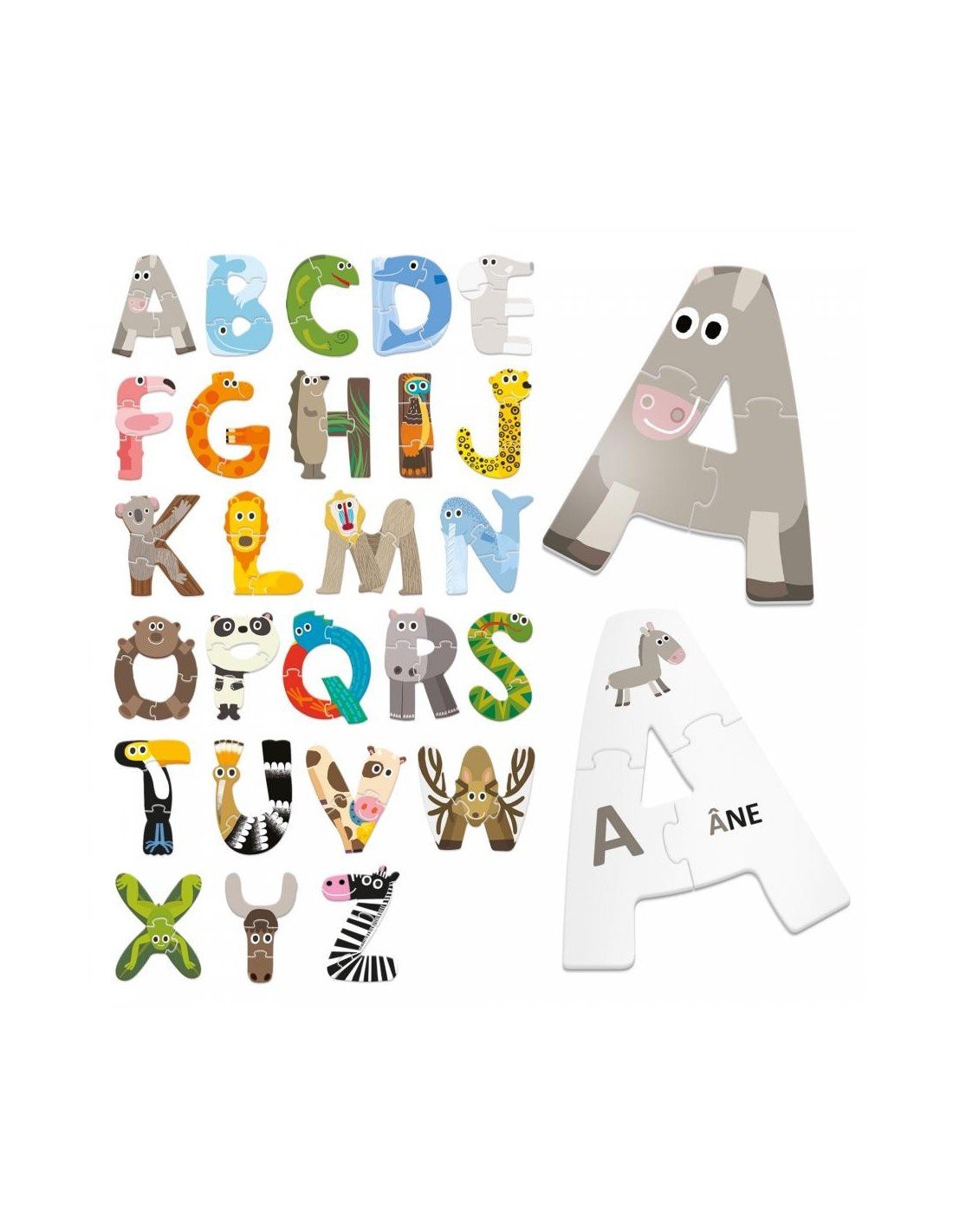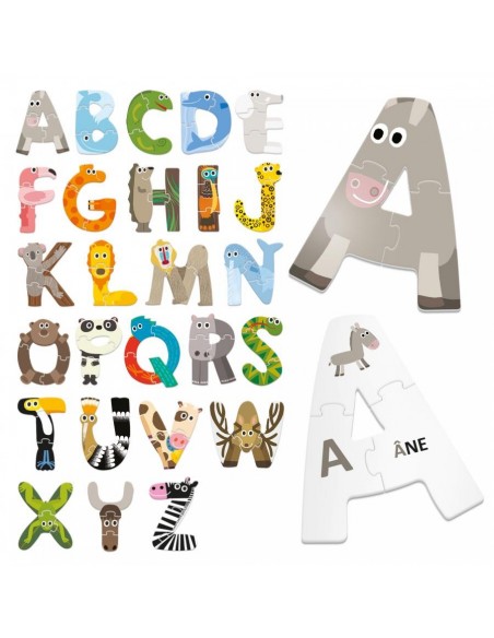 Ce jeu comprend 26 puzzles doubles faces correspondant aux 26 lettres de l'alphabet.