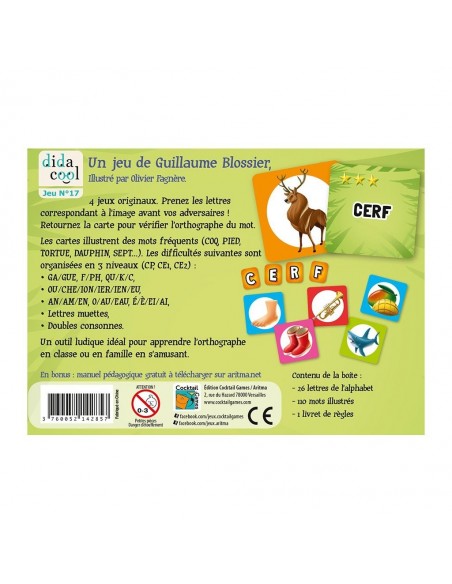 Contenu du jeu : 26 lettres alphabet , 110 mots illustrés , 1 livret de règles.