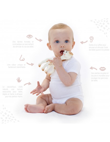 Avec simplicité, Sophie la girafe est un premier jouet vraiment complet, un grand classique pour les nourrissons du monde entier. Avec elle, tous les sens sont sollicités :