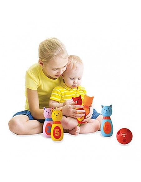 Le jeu de quilles "Chat" est conçu en plastique souple. Le touché des quilles est toujours aussi agréable et facilite la prise en main. Bébé pourra s'amuser à les renverser grâce à la balle et développer ainsi son habileté. Les couleurs, le design mignon des quilles et leur bruit au pincement de celle-ci attirent l'attention.