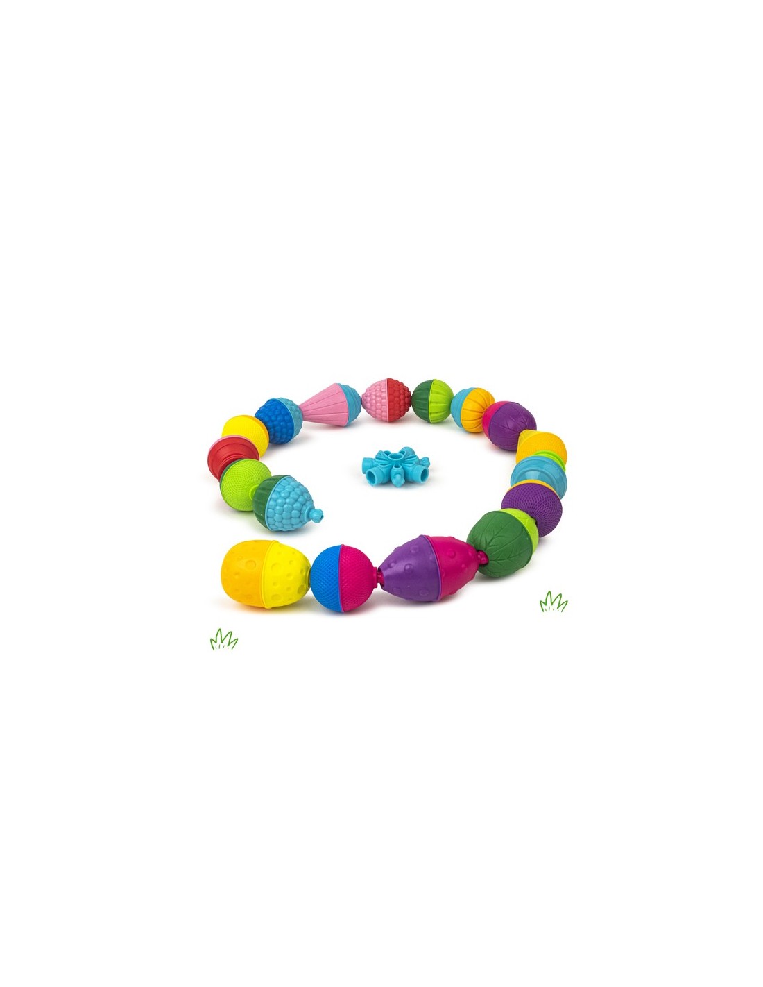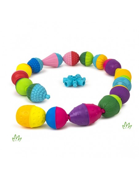 - À 10 mois, place aux découvertes sensorielles et au développement de l’acuité visuelle grâce aux différentes textures et couleurs des perles, que votre enfant commence à assembler