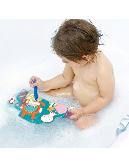 C'est aussi un livre de bain à colorier ! Pour encore plus de jeu, deux petits crayons permettront aux enfants d’exprimer leur créativité même à l’heure du bain. Coloriez puis plongez le livre dans l'eau et tout disparaît pour recommencer ! Déborder ne sera jamais un problème.