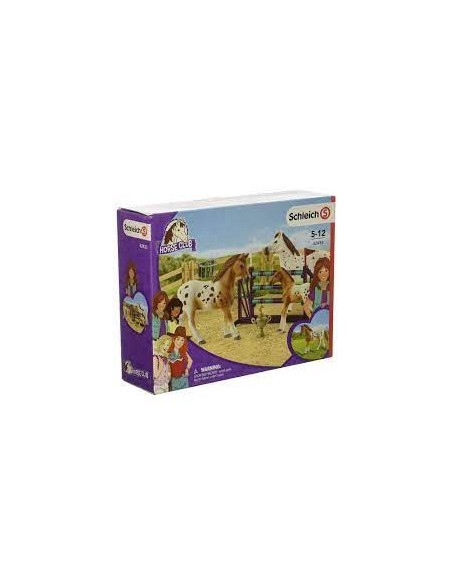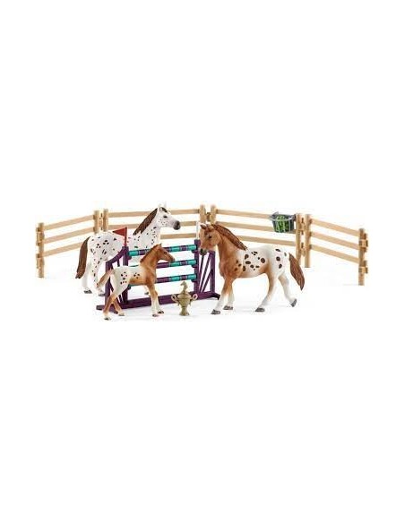 Contenu : 1x jument appaloosa, 1 x hongre appaloosa , 1 x poulain appaloosa, 5x paddocks, 1x râtelier, 1x pommes, 1x obstacle, 1x coupe