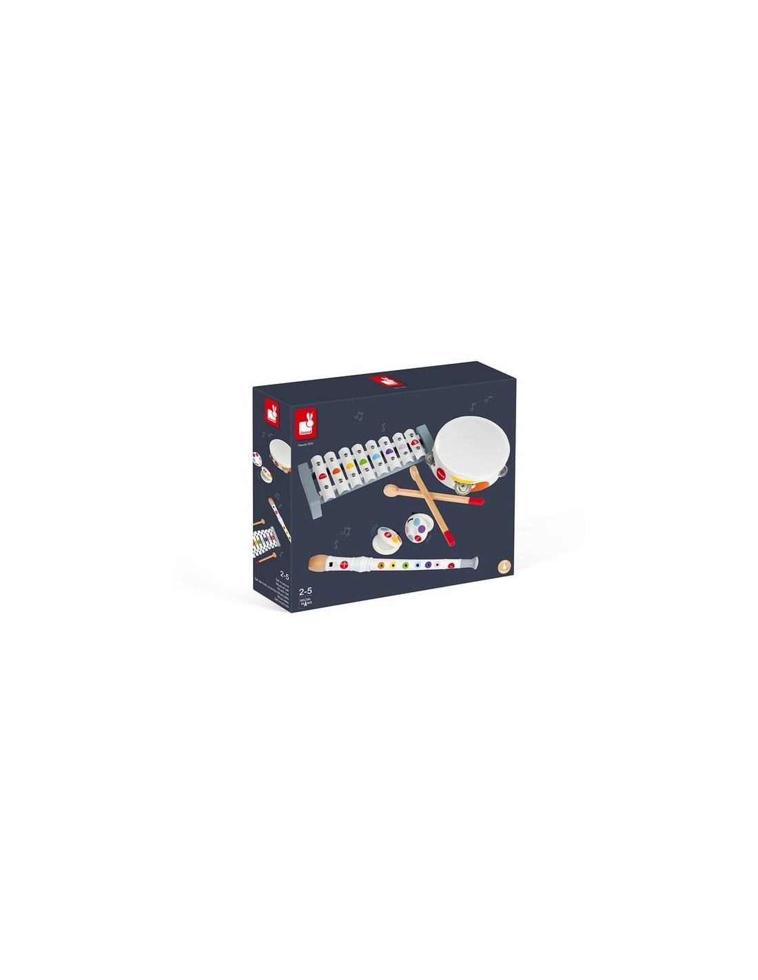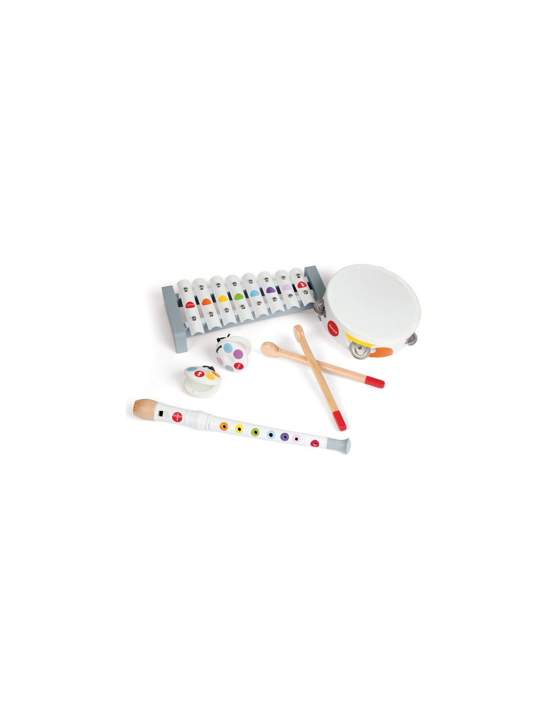 Ce set musical en bois comprend 4 jouets instruments de musique pour enfant à partir de 2 ans. Il permet aux enfants de tester plusieurs instruments et de trouver leur préféré ou de créer leur propre groupe de musique avec leurs frères, sœurs et amis. Vos enfants vont pouvoir s'amuser à souffler dans la flûte, secouer le tambourin à cymbales, tapoter sur le xylophone ou encore agiter les castagnettes entre leurs mains !