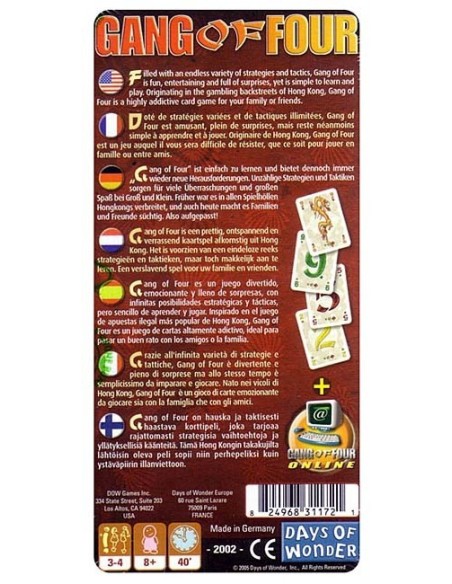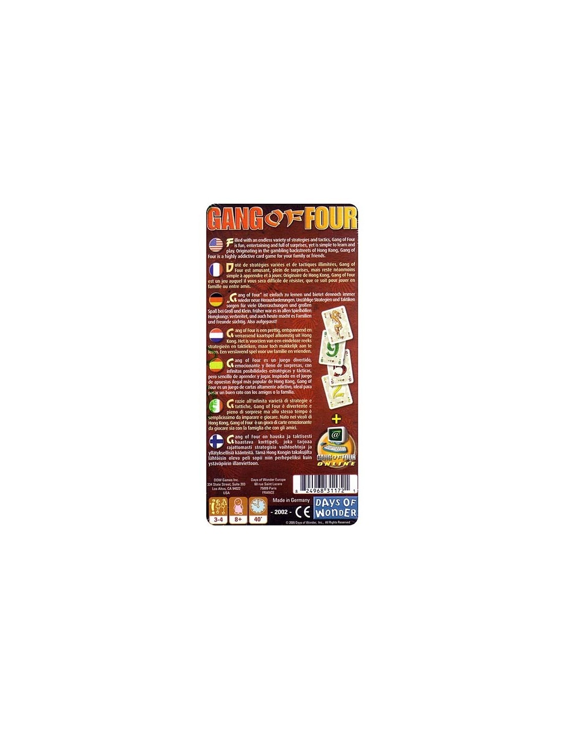 Très fin, stratégique autant que tactique, Gang of Four est un jeu passionnant, divertissant,riche en surprises, tout en restant simple à apprendre. Il se jouera en famille mais aussi entre amis, pour des parties rapides et improvisées.