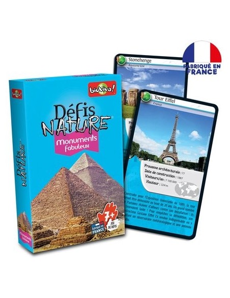Défis Nature - Monuments fabuleux vous emmène à la rencontre des monuments les plus spectaculaires ! Découvrez leurs caractéristiques, puis pariez sur leurs points forts pour collecter toutes les cartes du jeu et remporter la partie. Alors, prêts à relever le défi ?