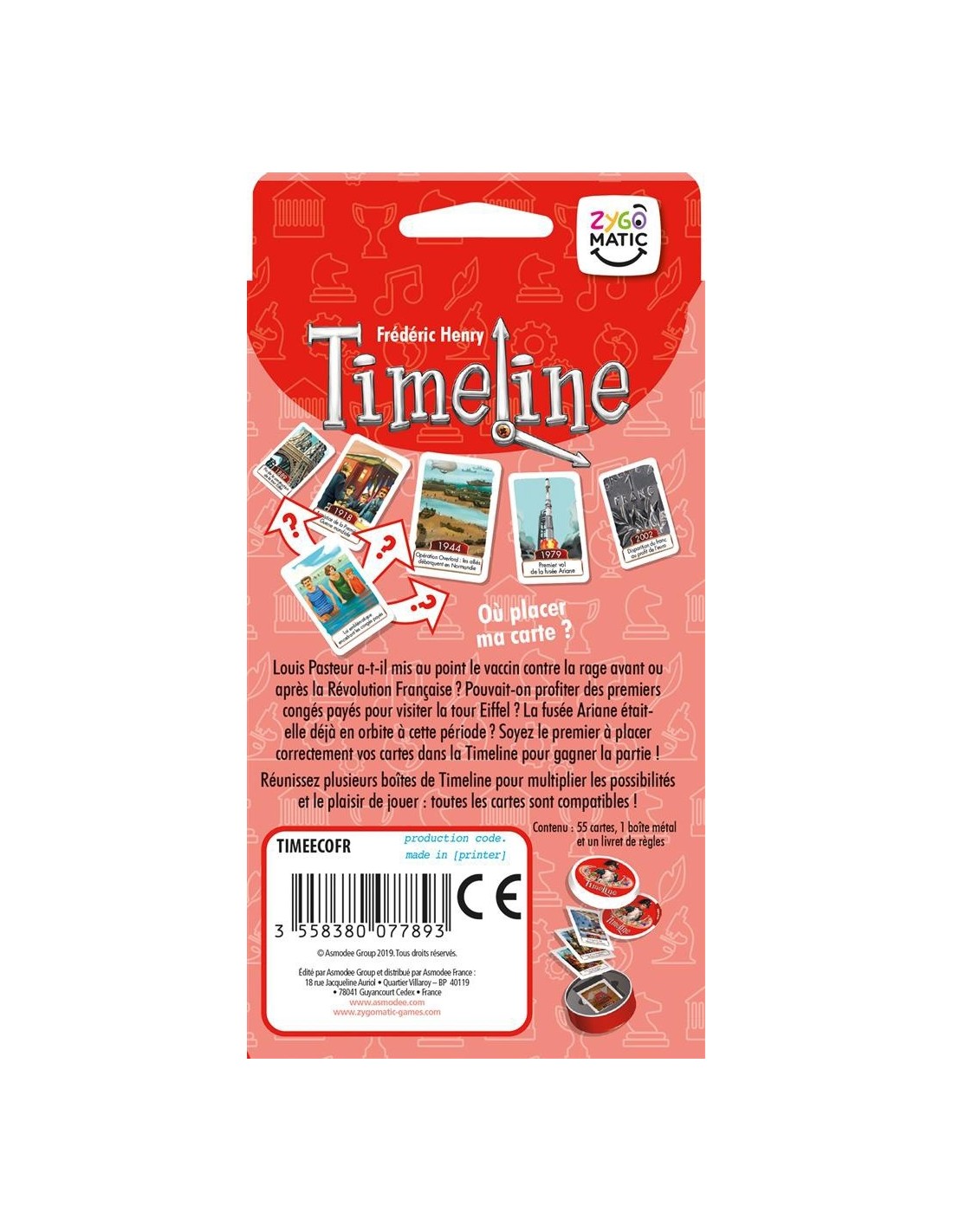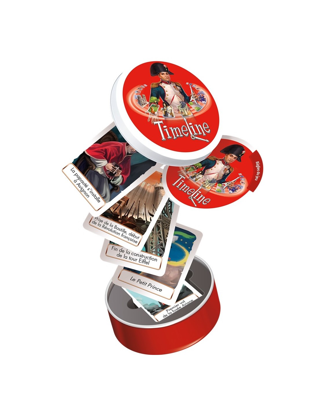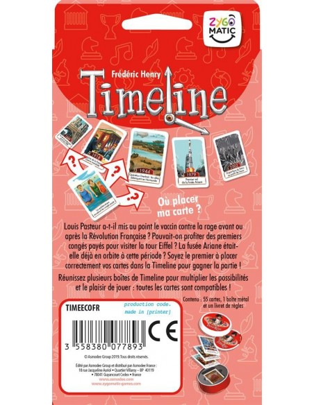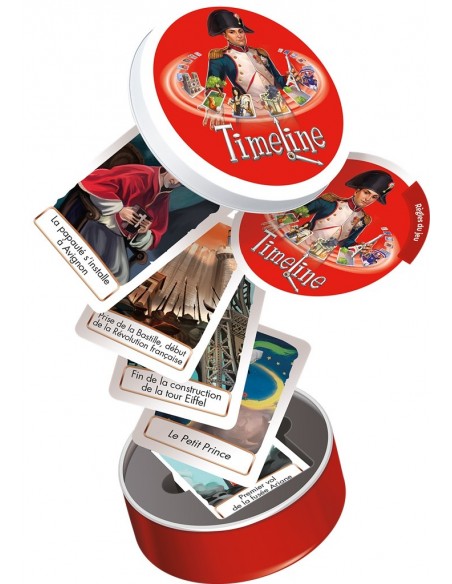 Visitez les grands moments de l'Histoire de France à travers un jeu simple et familial. Classez les cartes les unes par rapport aux autres, dans le bon ordre chronologique. Êtes-vous bien certain que Vercingétorix a rendu les armes à César après la prise de la Bastille ? À vous de placer correctement toutes vos cartes sur la ligne de temps ! Les joueurs reçoivent tous un même nombre de cartes représentant différents événements. Au verso de chaque carte est indiquée une date. Une carte tirée au hasard parmi les cartes restantes est placée au centre de la table face date visible. Elle constitue le point de départ d’une ligne chronologique qui sera peu à peu complétée par les joueurs. Le premier joueur choisit l’une de ses cartes. S’il pense que l’événement de sa carte a eu lieu avant celui de la carte initiale, il pose sa carte à gauche de cette dernière. S’il estime que son événement s’est déroulé après, il place sa carte à droite de la carte initiale. La carte du joueur est alors retournée, face date visible. S’il a raison, elle reste en place. Sinon, il défausse sa carte et doit en piocher une autre pour la remplacer. La partie continue dans le sens des aiguilles d’une montre. Plus il y a de cartes placées, plus il est difficile d’en poser de nouvelles sans se tromper ! Si à la fin d’un tour, un seul joueur n’a plus de cartes, ce dernier gagne la partie. Attention, les cartes de Timeline Histoire de France, sont une sélection de cartes issues de la précédente édition de Timeline Histoire de France.