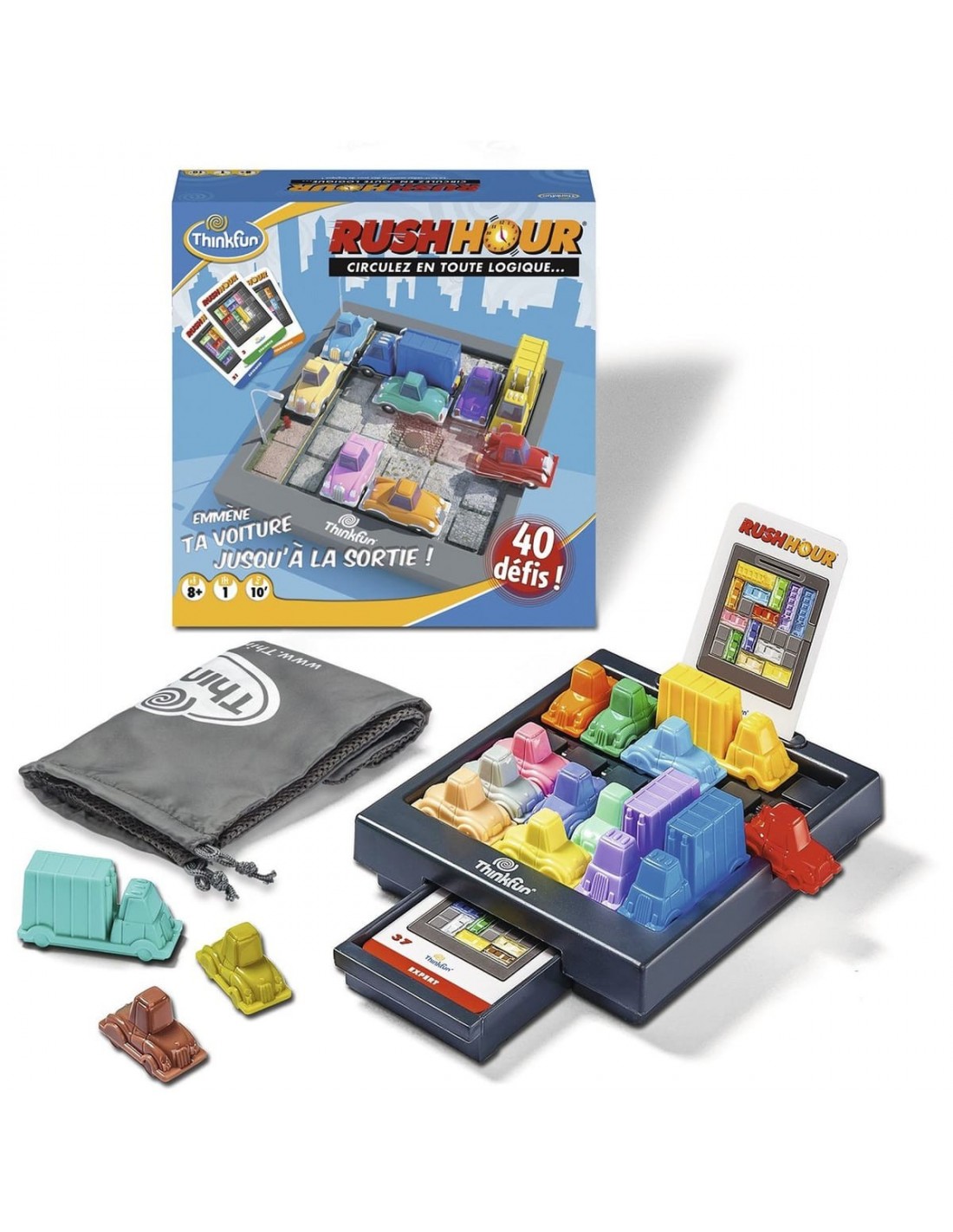 La boite contient un plateau de jeu Rush Hour avec un rangement de carte intégré, 15 véhicules de blocage, 1 voiture rouge, 40 cartes de défis de débutant à expert avec les solutions, un sac pour emporter son jeu partout et un livret de règles.