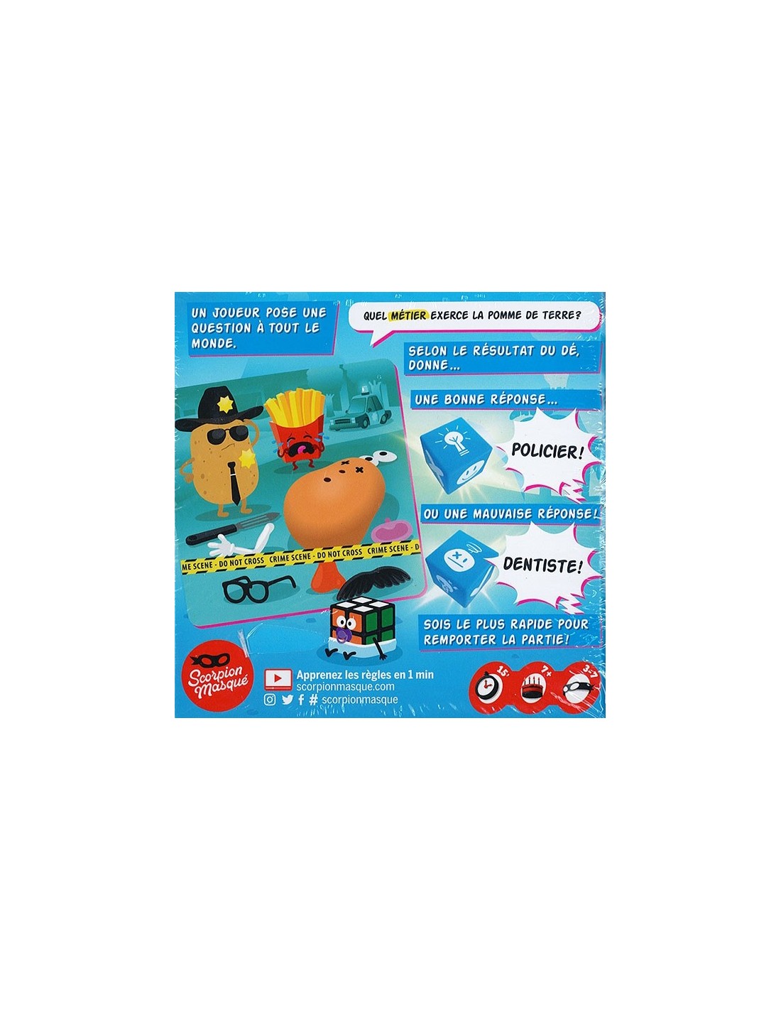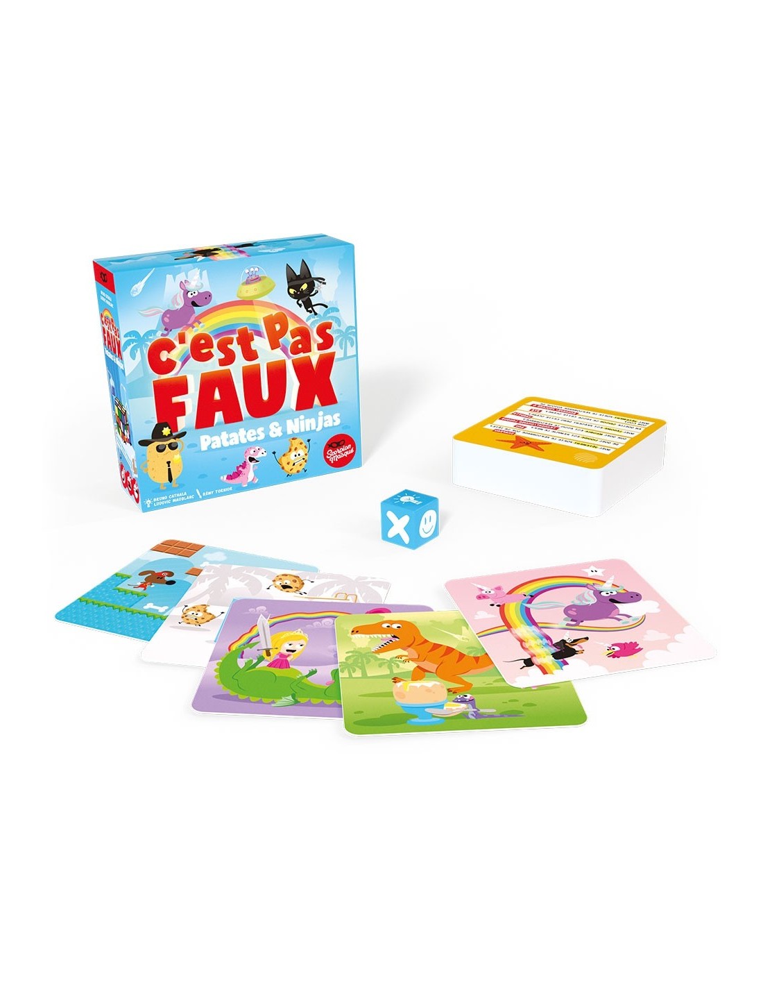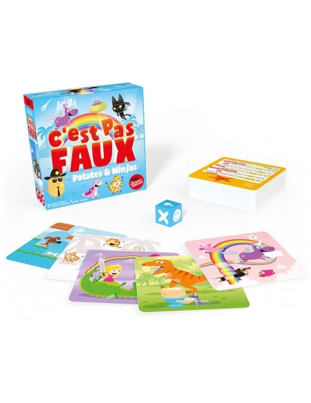 C'est pas faux patates et ninjas, un jeu de quizz ou l'important n'est pas de connaitre la bonne réponse mais de savoir quand répondre juste ou faux. Dans ce jeu de questions loufoques, les joueurs observent une illustration, tout en répondant à une question la concernant. Chacun n'a droit qu'à une seule réponse. Jusque-là rien de très difficile. Mais selon la consigne, il va falloir donner tantôt une bonne réponse, tantôt une réponse erronée. Parfois même, vous serez confrontés à des questions qui n'ont aucun sens. Dans ce cas figure, inutile de vous tordre les neurones, contentez-vous de crier bien fort "C'est pas faux !". Alors, quel âge avait Mozart ? Un jeu de société marrant pour toute la famille qui provoquera des rires. La boite contient 53 cartes Questions, 3 cartes règles, 1 aide-mémoire et 1 dé. De 3 à 10 ans.
