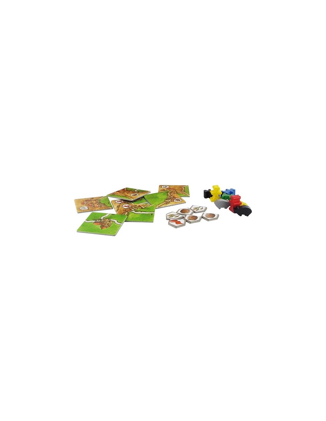 La boite contient : 24 tuiles de paysage, 20 jetons marchandises, 6 bâtisseurs en bois, 6 cochons en bois et 1 sac en tissu.