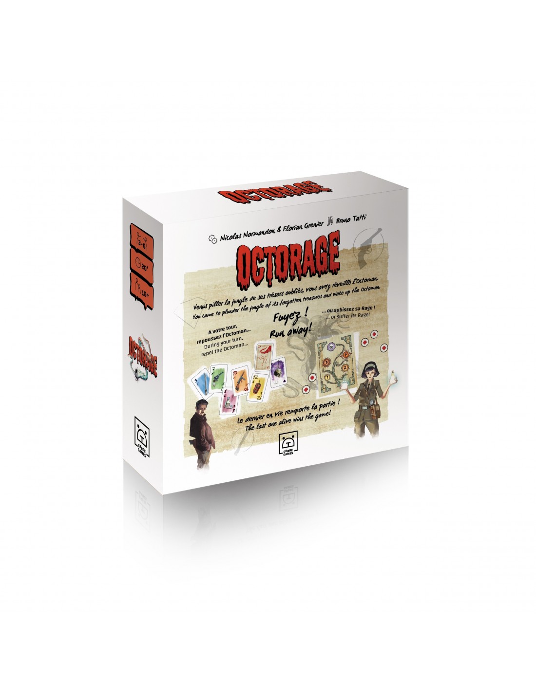Mercenaires venus piller la jungle de ses trésors oubliés, vous avez réveillé l’Octoman. Il va falloir courir pour ne pas être dévoré ! Pour survivre, il vous faudra gérer aux mieux vos armes, abandonner vos trésors s’il le faut et attirer Octoman sur vos compagnons d’infortunes ! Pour survivre et triompher de l’Octoman : gérez au mieux votre main de cartes, esquivez le et repoussez le sur vos compagnons d’infortune. Une partie d’Octorage se déroule en plusieurs manches. Dès qu’un joueur totalise 2 manches gagnées, il remporte la partie. A tour de rôle, les joueurs vont pouvoir jouer une carte : – Arme dont la valeur doit être supérieure ou égale à la dernière carte Arme jouée. Si la carte est de vale