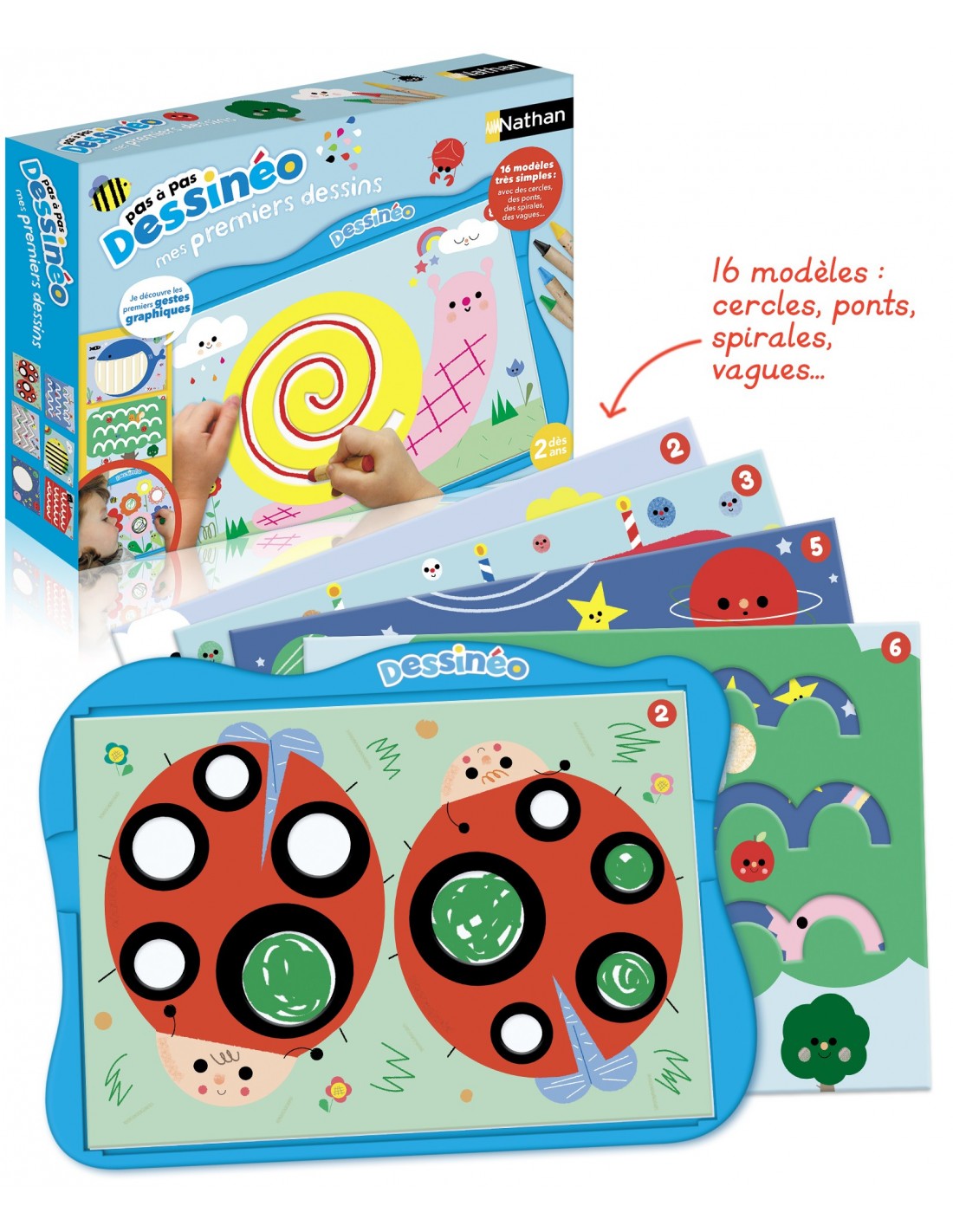 Dessinéo, un premier jeu pour apprendre à faire ses premiers traits et motifs grâce à 16 modèles de dessins évolutifs. Les pochoirs en carton guident le trait de l’enfant et l’accompagnent pour passer du gribouillage aux premiers traits maîtrisés. Une fois le trait réalisé il peut retirer le pochoir et terminer son dessin en laissant parler son imagination.