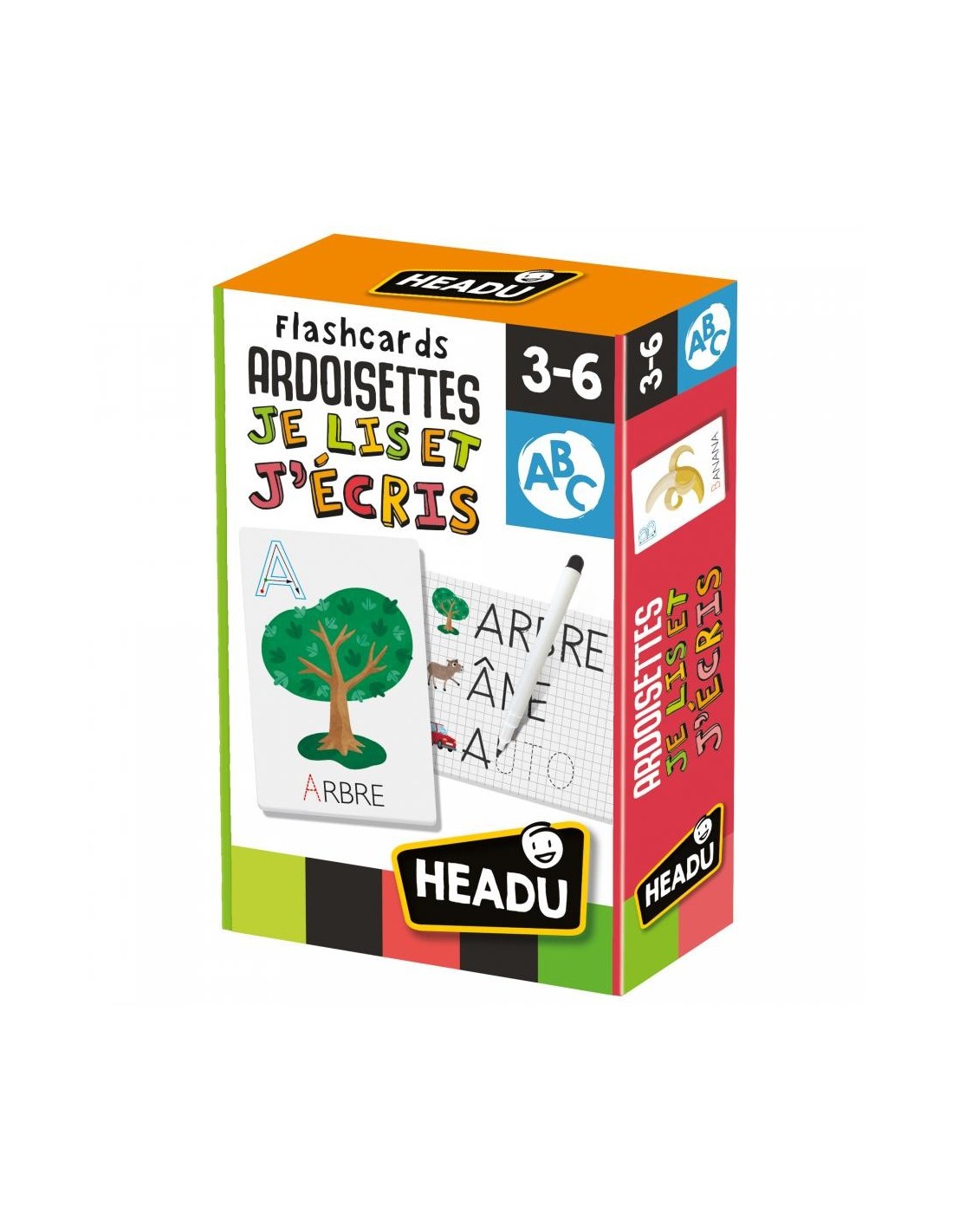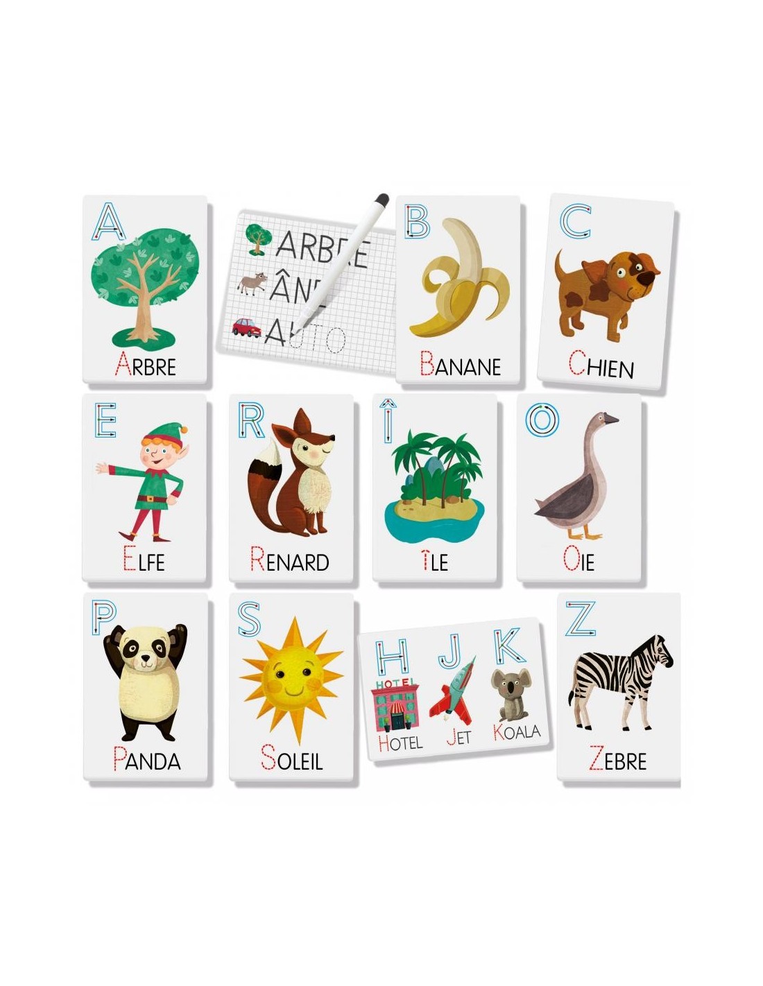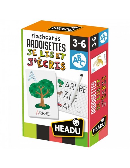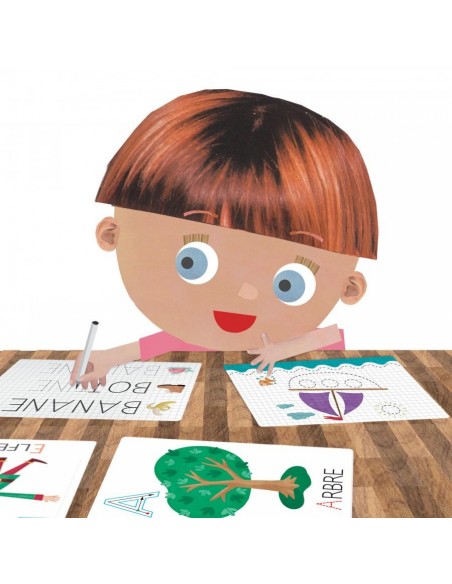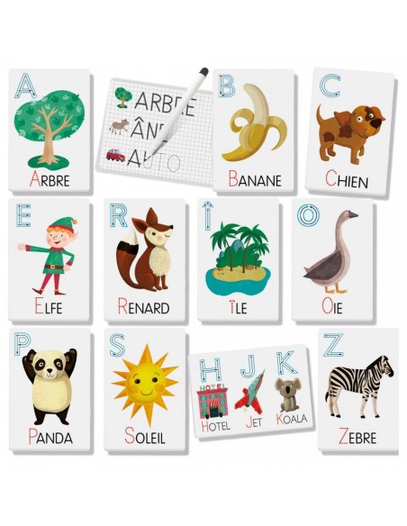 Ces grandes flashcards sont autant de petites ardoises pour apprendre à lire et écrire dès le plus jeune âge. D’un côté les enfants découvrent les phonèmes et les associent à la forme des lettres correspondantes, de l’autre ils s’habituent à écrire en traçant les mots avec le feutre effaçable.