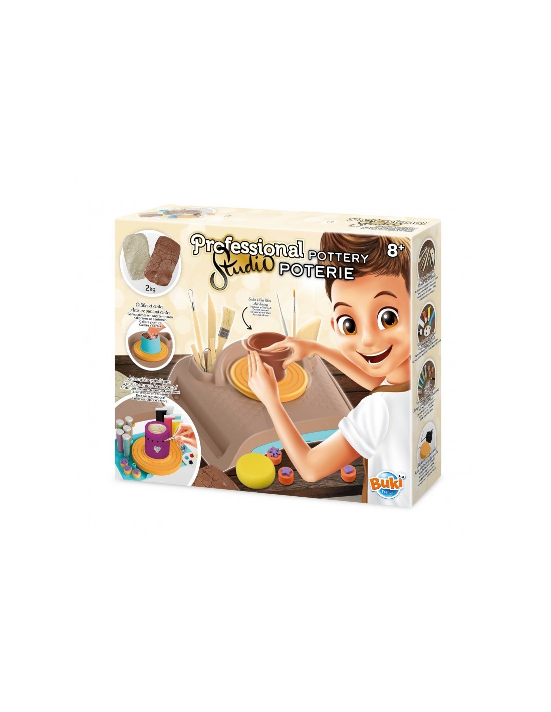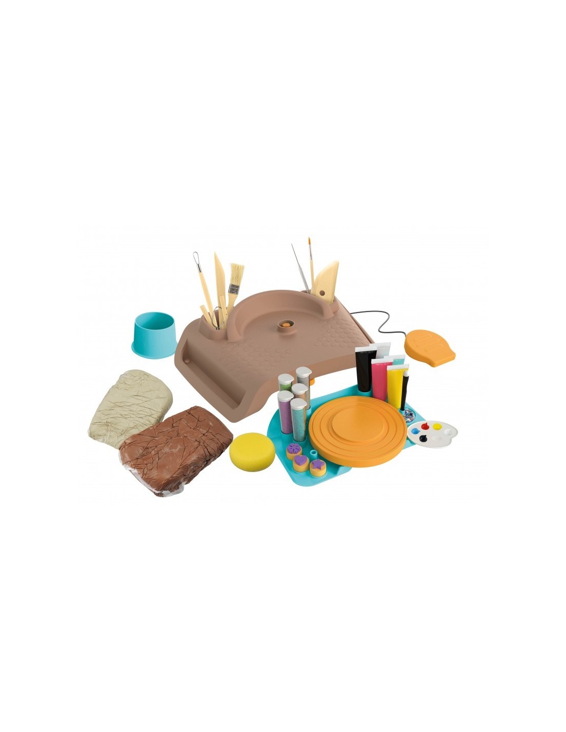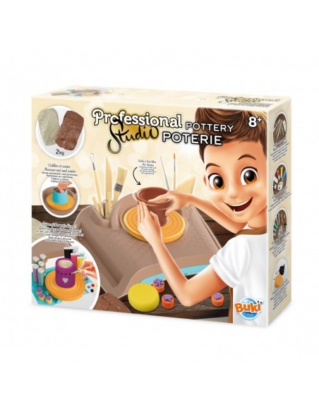 Avec ce Professional Studio votre enfant s'initie à l'art fascinant de la poterie ! A l'aide du studio stable, des outils en métal, de l'argile et de la peinture en pots individuels, il se lance dans ses premières créations. Avec la girelle amovible qui se fixe ensuite sur le tiroir, ses premières créations seront couronnées de succès et il peut se concentrer entièrement sur le séchage et la décoration. Peinture, paillettes ou même transferts, il à l'embarras du choix pour les personnaliser ! La rigole l'aide à récupérer l'eau qui ruisselle et le moteur amovible permet de laver facilement l'atelier. En plus de stimuler sa créativité au service d'une activité originale, ce studio de poterie développe aussi la précision de ses gestes.